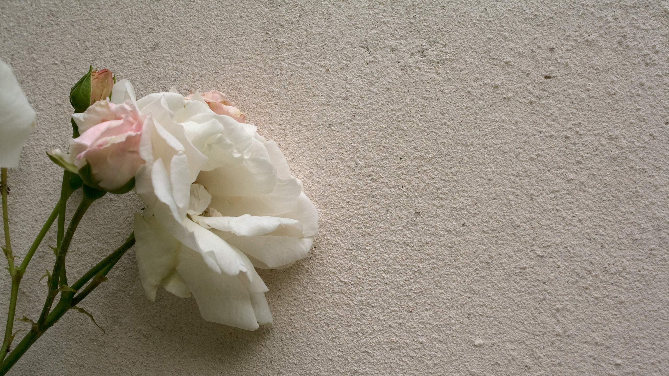 Detail van de structuur van het pleisterwerk. Het Barok Wit past perfect bij de roos die naast de garage groeit.
